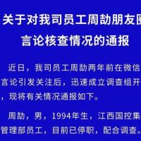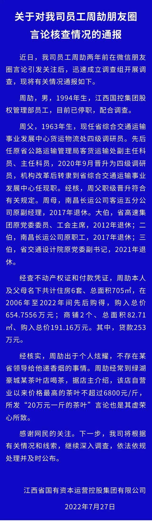 7月27日凌晨,江西国控就员工周劼朋友圈炫富、秀特权一事做出回应。通报称,周劼的多条朋友圈是出于个人炫耀目的而编造,不存在某省领导给他递香烟的事情,所发“20万元一斤的茶叶”言论也是其虚荣心所致。周劼父亲现任江西省综合交通运输事业发展中心货运物流处四级调研员,职级晋升符合有关规定。目前,周劼已被停职配合调查。(7月27日正观新闻)