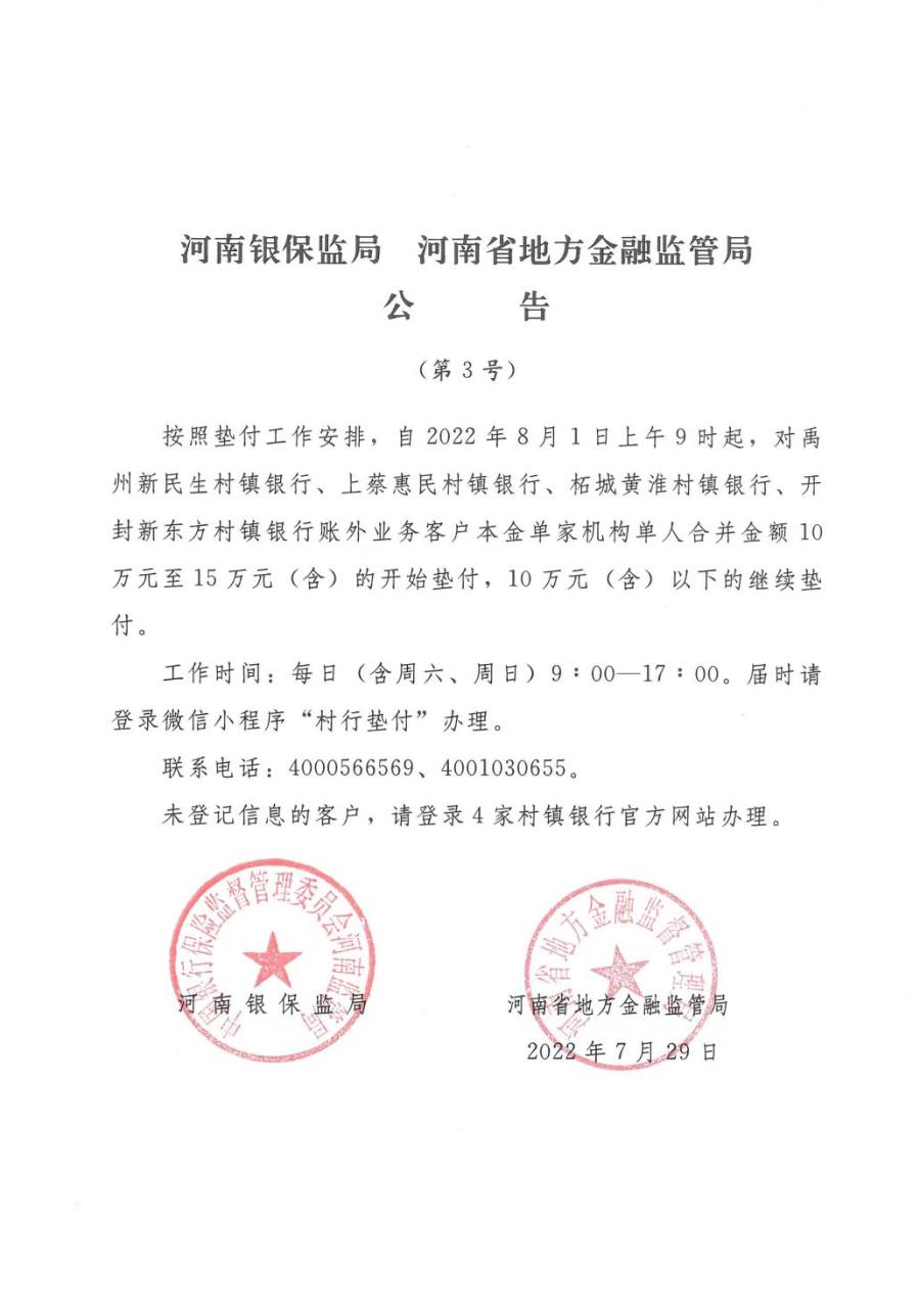 7月29日,河南银保监局、河南省地方金融监管局发布公告称,自2022年8月1日上午9时起,对禹州新民生村镇银行、上蔡惠民村镇银行、柘城黄淮村镇银行、开封新东方村镇银行账外业务客户本金单家机构单人合并金额10万元至15万元(含)的开始垫付,10万元(含)以下的继续垫付。