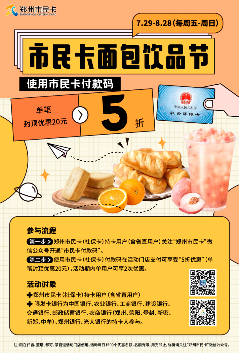 7月29日至8月28日的每周五至周日,共15个活动日,总计2.25万个优惠名额——7月29日,记者从市人社局了解到,为提振企业发展信心,降低市民“夏日消费”成本,郑州社保卡(市民卡)开展“市民卡面包饮品节”活动,联合烘焙、饮品连锁企业,在线下200余家门店开展“市民卡付款码”支付单笔五折活动。