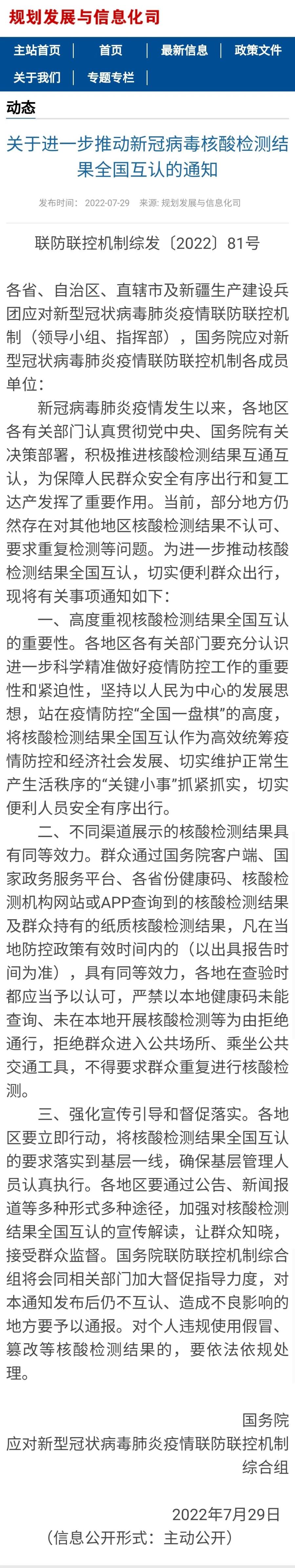 国务院联防联控机制29日印发通知,要求进一步推动新冠病毒核酸检测结果全国互认。通知要求: