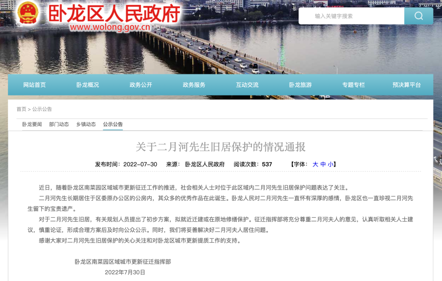 7月30日,南阳市卧龙区人民政府网站今日发布《关于二月河先生旧居保护的情况通报》,全文如下: