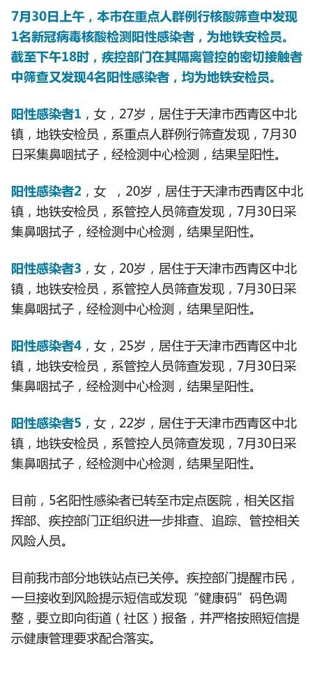 据@天津健康7月30日晚消息,天津市新增本土阳性感染者5例,均为地铁安检员。