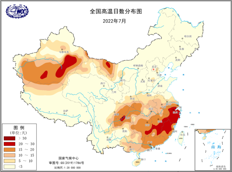 今年7月全国大部地区气温偏高,按照面积加权,平均气温为23.15℃,为有完整观测以来,第二热的月份(仅次于2017年7月的23.17℃)。