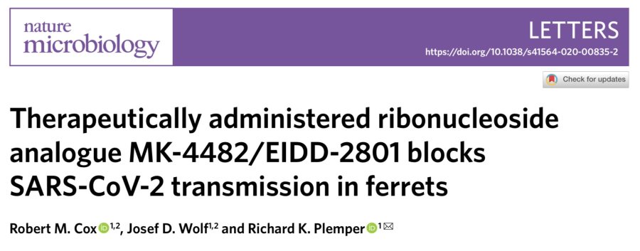 该论文题为“Therapeutically administered ribonucleoside analogue MK-4482/EIDD-2801 blocks SARS-CoV-2 transmission in ferrets”,通讯作者为美国乔治亚州立大学的Richard Plemper。