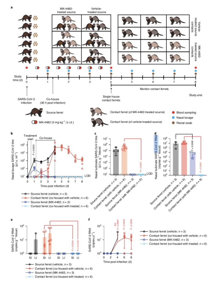 结果显示,接受MK-4482/EIDD-2801治疗的雪貂,其上呼吸道的SARS-CoV-2水平明显减少,而对照组雪貂的鼻甲(鼻道)在感染3.5天后仍携带可检测到的病毒载量,并到研究结束都一直具有传染性。所有雪貂的鼻组织内都检测到了SARS-CoV-2的RNA,但其水平在接受MK-4482/EIDD-2801治疗的雪貂组明显减少。