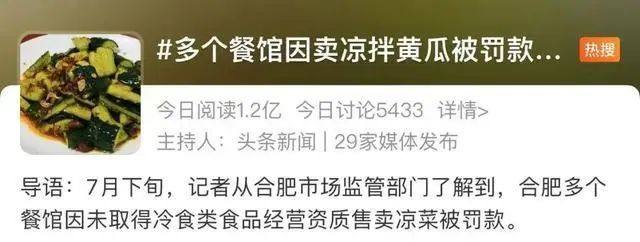 再普通不过的凉拌黄瓜,近日上了热搜。据报道,7月下旬,安徽合肥多个餐馆因未取得冷食类食品经营资质售卖凉菜被罚款。其中,包河区一家门店因无资质在外卖平台上售卖凉拌黄瓜,被处以5000元罚款;庐阳区某餐饮店也因在网上销售凉拌黄瓜被罚款5000元。(据7月31日大皖客户端)