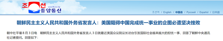 据朝中社8月3日报道,朝鲜外务省发言人当天就最近美国众议院议长访台引发国际社会越来越大的担忧一事,回答了朝中社记者提问。朝鲜外务省发言人表示,“我们谴责和反对外部势力在台湾问题上的干涉行为,并对中国政府坚决捍卫国家主权和领土完整的正义立场表示完全支持。美国阻碍中国实现发展壮大、完成统一事业的企图必遭坚决挫败”。