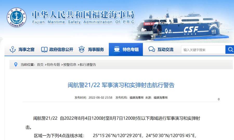 福建海事局:8月4日至7日,6个海域进行军事演习和实弹射击