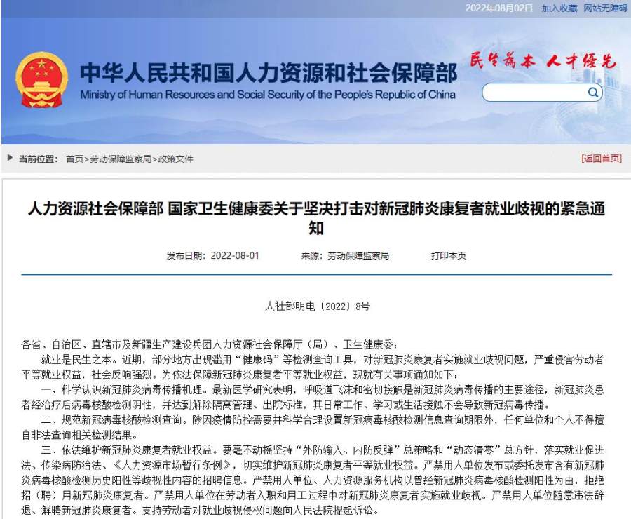 8月1日,人社部和国家卫健委发布通知,坚决打击对新冠肺炎康复者的就业歧视。与此同时,多地多部门也明确,不得歧视新冠康复者。