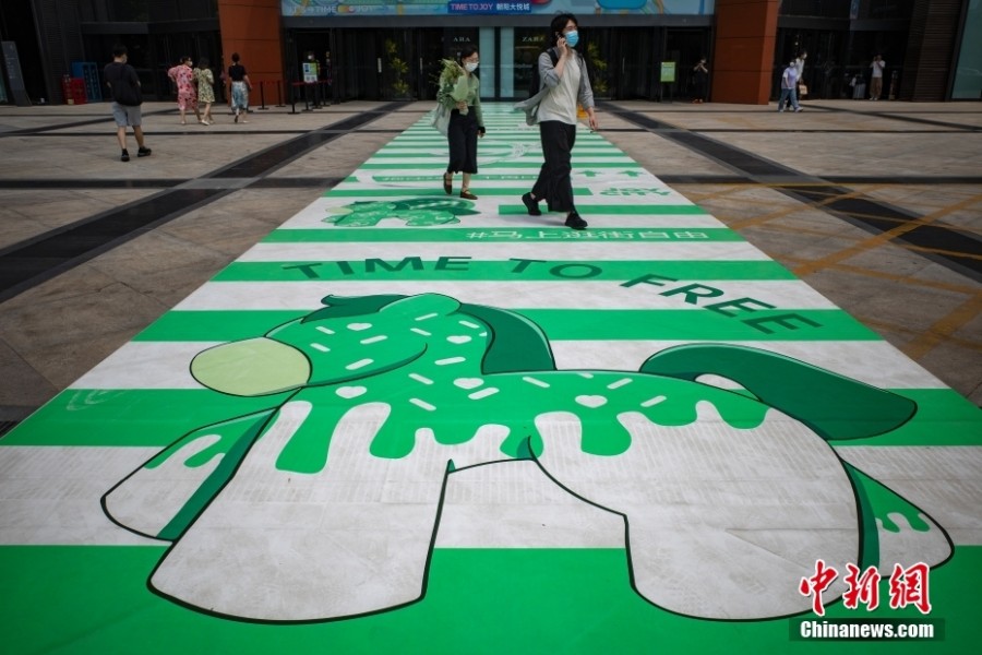 资料图:北京市朝阳区一家大型综合商场入口处地面贴有商家布置的“绿马”主题促销宣传画,以谐音健康码“绿码”的方式,招揽顾客入内消费。 中新社记者 侯宇 摄