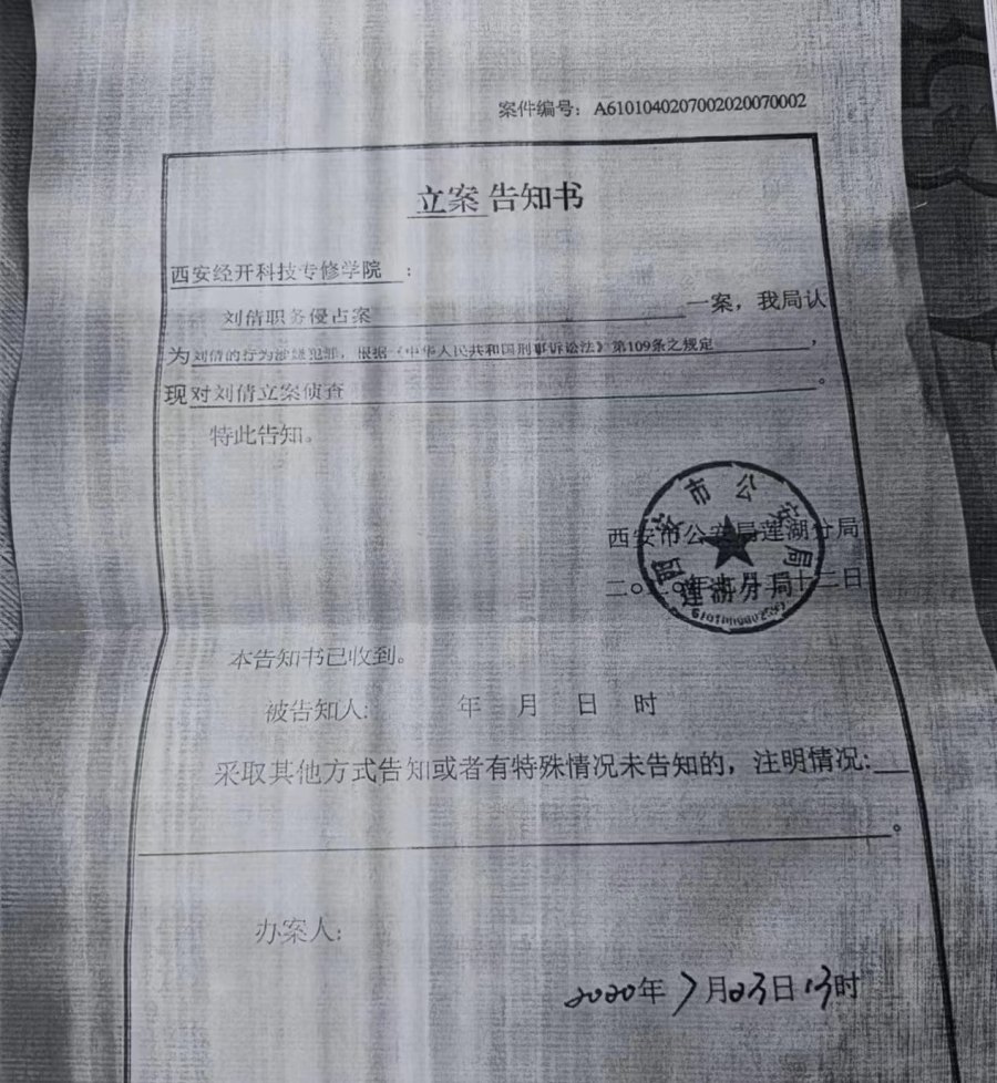 “立案告知书”显示,西安市公安局莲湖分局于2020年7月23日以“职务侵占”对刘倩进行立案侦查。刘倩在办理了取保候审后潜逃,警方网上通缉后,刘倩在榆林市神木市因其他案件电信诈骗被警方羁押。
