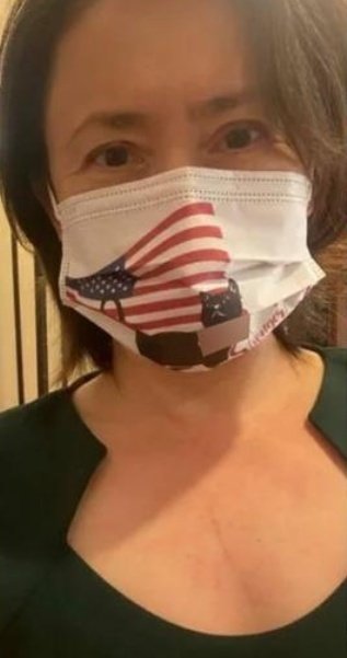 去年7月2日,为了感谢美国给台湾捐疫苗,萧美琴特意戴上一款订制口罩,口罩上以美国国旗当背景,上面印着萧美琴的宠物猫。