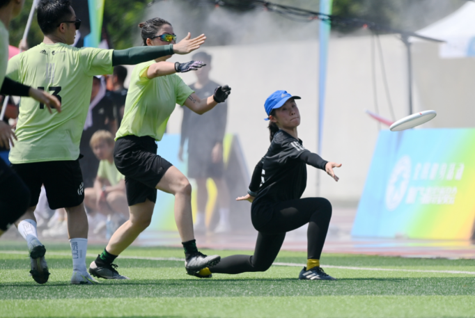 8月6日,UPLUS油泼辣子飞盘队队员骆华玥(右)在比赛中。UPLUS油泼辣子飞盘队以7比1战胜超光速俱乐部西安分部队。