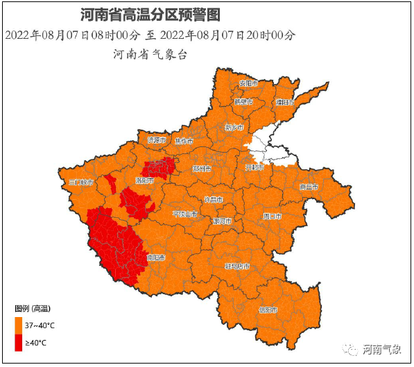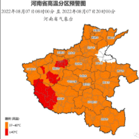 河南省气象台2022年08月07日08时00分继续发布高温橙色预警:预计8月7日白天,全省大部最高气温将升至37℃以上,其中三门峡南部、洛阳、南阳西部部分县市最高气温将升至40℃以上。8月8日白天,黄河以南大部最高气温将升至37℃以上,其中洛阳市区、南阳西部和南部、平顶山南部、信阳东部最高气温将升至40℃以上。请注意防范。上述地区的相邻县市(区)也需关注。