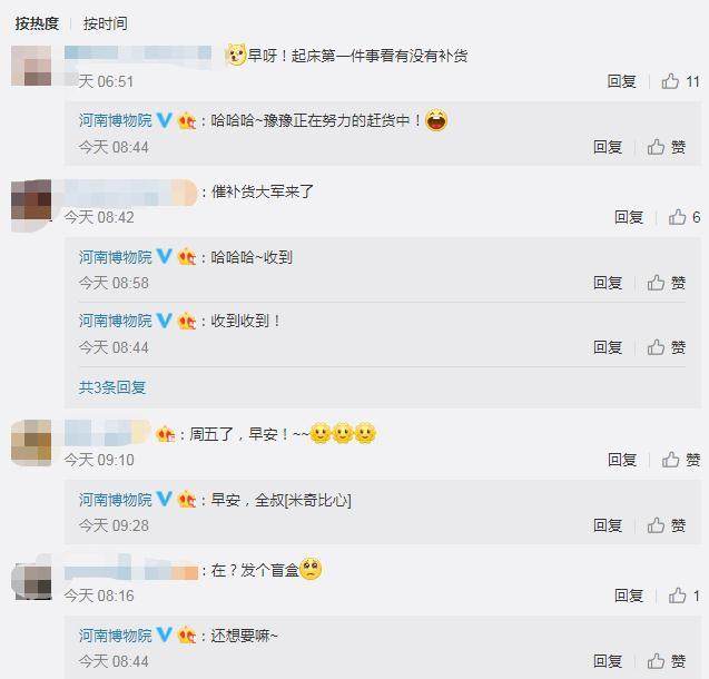 截至12月4日下午17时,这款盲盒仍然显示缺货状态,根据产品描述,新款盲盒的补货预计还要等待10-20天。4日一大早,就有好多网友跑去河南博物院的官微催补货,中午时,店铺刚补货就在半小时内售罄,工作人员表示正在加紧补货中。