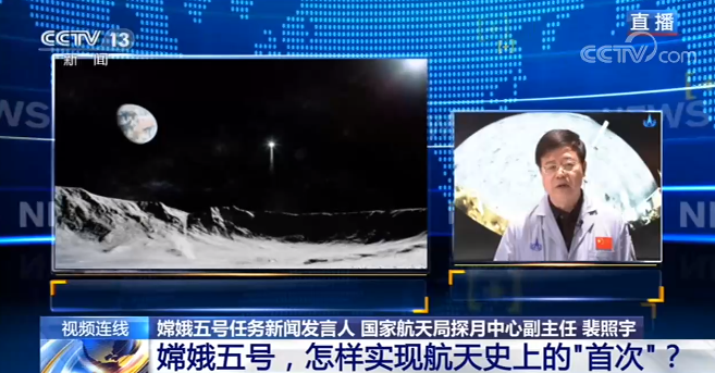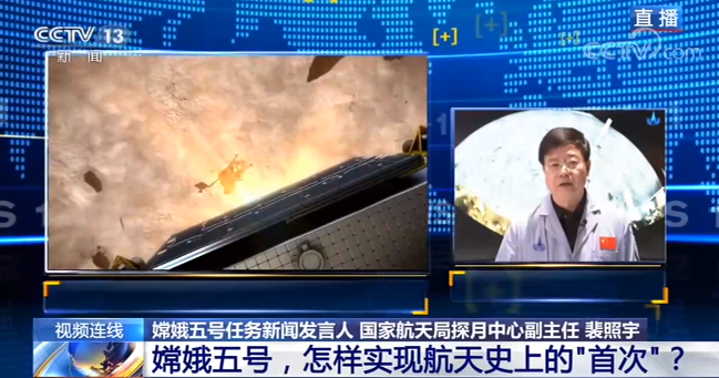 裴照宇:上升器昨天实现月面起飞之后,进入到预定的轨道,到现在为止我们对它做的主要工作是进行两次远程导引控制,其目的是其于瞄准与轨道岂交会时的预定时间,目标位置和速度,这是两次远程导引,我们还需要进行两次远程导引才能达到刚才所说的预定时间,预定目标和预定速度,之后将转入到由轨道器实施的自主控制阶段,目前上升器与轨道器处在同一个平面内飞行,其轨道高度低于轨道器,处在轨道器的后下方,现在各设备均工作正常。