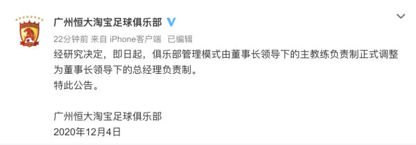 12月4日晚,广州恒大淘宝足球俱乐部发布公告称,即日起,俱乐部管理模式由董事长领导下的主教练负责制正式调整为董事长领导下的总经理负责制。
