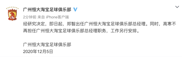 5日凌晨,广州恒大俱乐部发布第二个公告称,即日起,郑智出任广州恒大淘宝足球俱乐部总经理。同时,高寒不再担任广州恒大淘宝足球俱乐部总经理职务,工作另行安排。