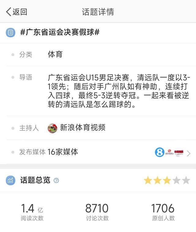 8日,一则 #广东省运会决赛假球# 的话题词条,在很长时间占据微博热搜高位。截止至发稿时,此话题阅读量突破1.4亿,近9000人次参与讨论。
