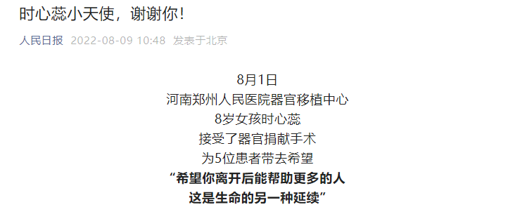 郑州8岁女孩病逝捐器官,为5名患者带去新生和光明