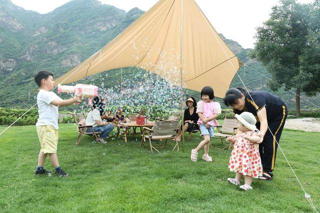7月2日,游客在河北省保定市涞水县的野三坡景区露营基地休闲玩耍。