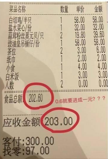 近日,一女子在深圳某小有名气的连锁餐厅就餐,结算时账单上显示食品总额为 202.6 元,应收金额处却变成203元,询问原因时被收银员告知“是要进上去的”。当事女子感到疑惑,什么时候有反向抹零这个道理了?虽然自己也不差这4毛钱,但被四舍五入进上去就很不爽。离开餐厅后,在现场没反应过来的她通过 "12315" 举报了商家。随后,商家与女子联系道歉,并对其203元全额退款。(8月8日九派新闻)