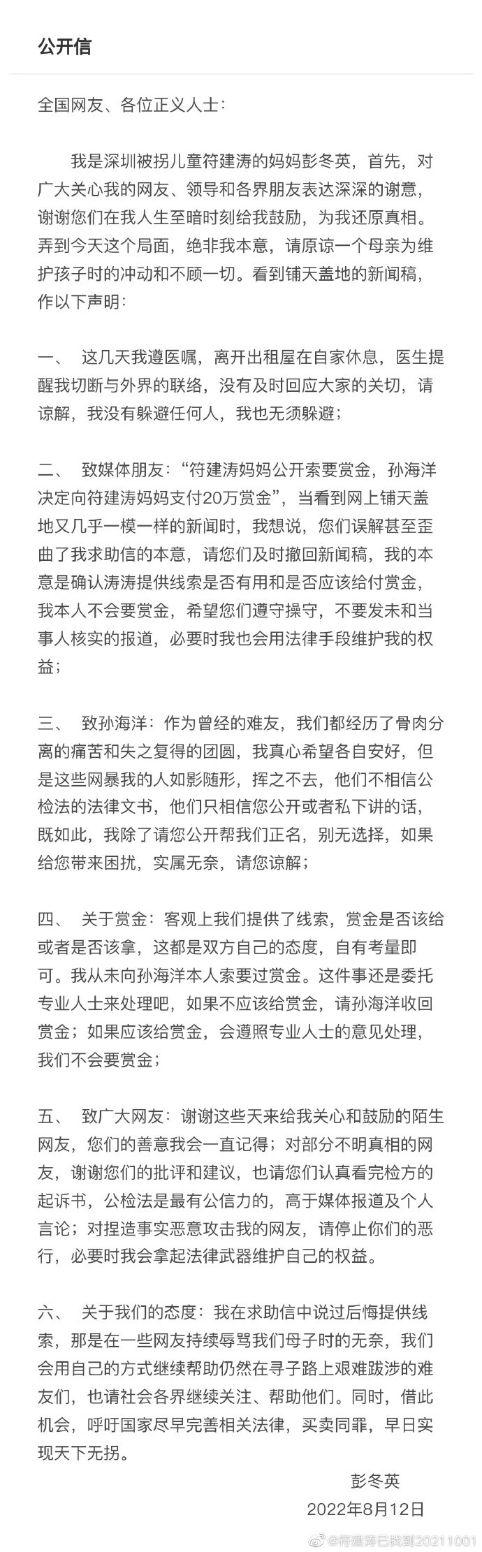 8月9日,被拐儿童符建涛的妈妈彭冬英在社交平台发布视频表示,其母子二人因找回孙卓的线索问题,半年来遭受到了部分网友的恶意攻击。她梳理出了网友的六种主要论调并一一进行了回应。
