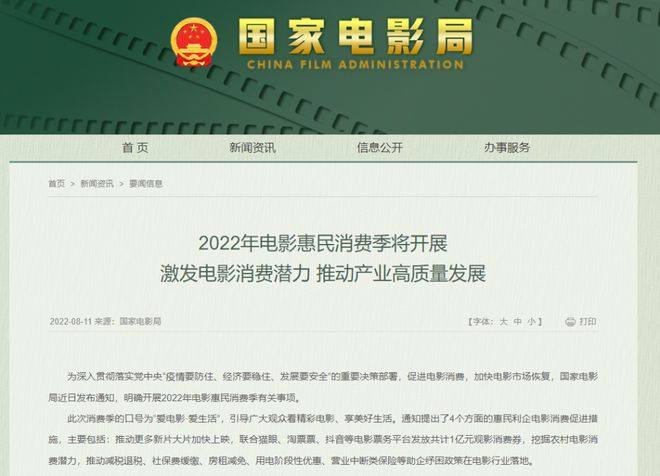 据悉,多部重量级新片推迟放映,电影投资公司成本压力剧增。为进一步激发电影消费潜力,促进电影市场有序复苏,国家电影局官网8月11日下发《关于开展2022年电影惠民消费季的通知》,宣布于2022年8月至10月,将联合猫眼、淘票票、抖音等电影票务平台,发放1亿元观影消费券,设立“爱电影·爱生活”2022年电影惠民消费季专区专栏,对观众购票费用予以补贴。