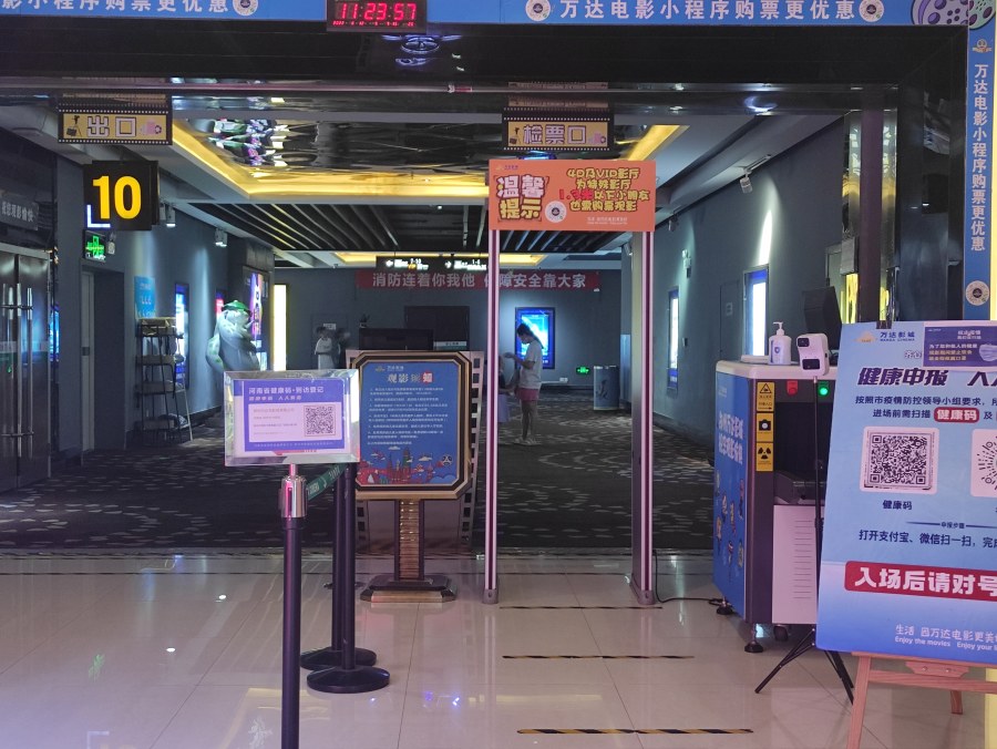 在郑州中原万达影城,排片检票工作有条不紊,消杀、扫码、隔位等各项防疫措施也严格实行。虽是周五工作日时间,仍有一些年轻人和小孩购票观影。