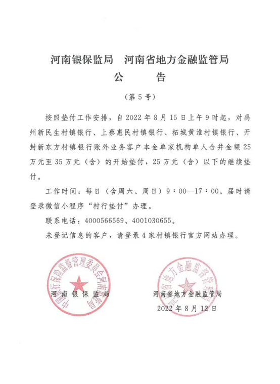 8月12日,据河南省地方金融监管局网站消息,河南银保监局、河南省地方金融监管局发布公告,自2022年8月15日上午9时起,对禹州新民生村镇银行、上蔡惠民村镇银行、柘城黄淮村镇银行、开封新东方村镇银行账外业务客户本金单家机构单人合并金额25万元至35万元(含)的开始垫付,25万元(含)以下的继续垫付。
