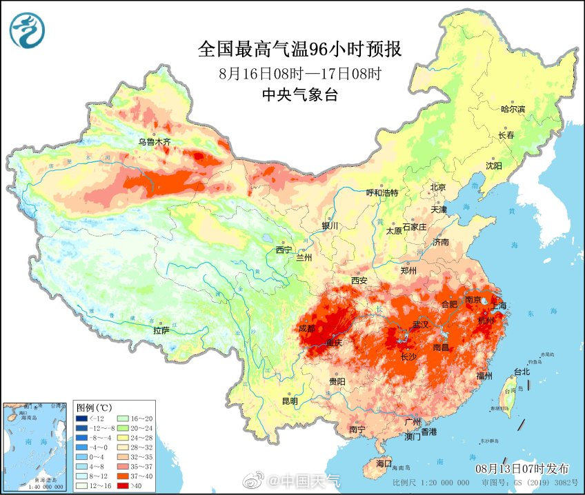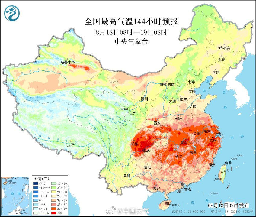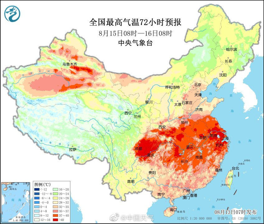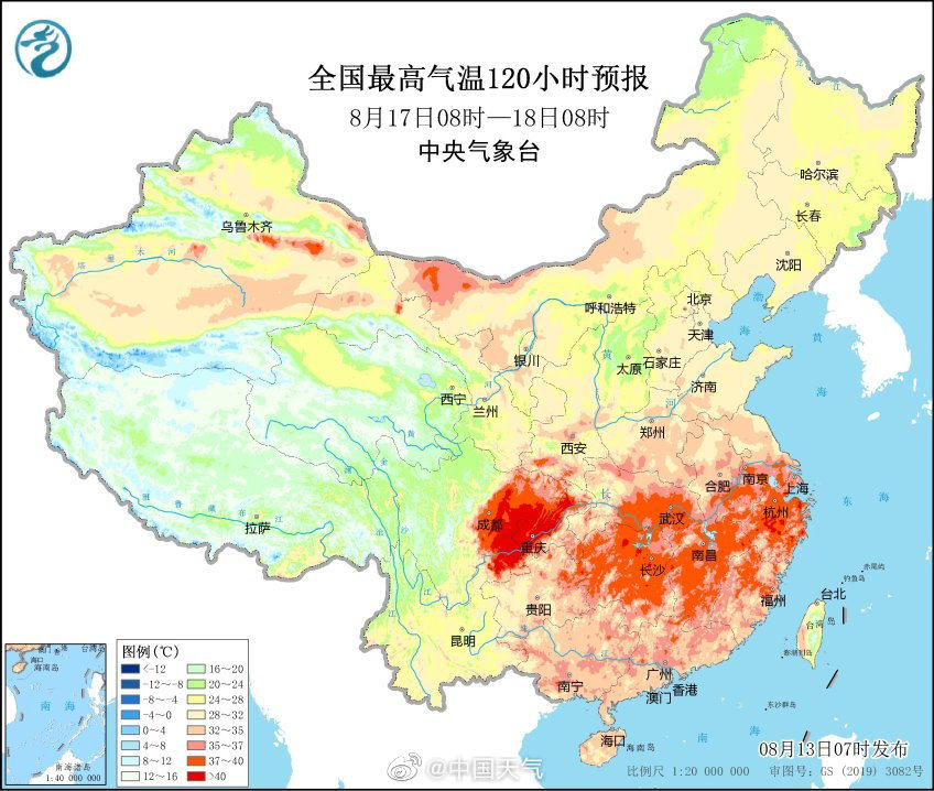 中央气象台预计,未来一周(8月13日至19日),江汉、江淮、江南及四川盆地等地大范围高温天气仍将持续,四川东部、重庆、湖北、安徽南部、江苏南部、浙江、湖南北部等地的部分地区最高气温可达40℃以上。