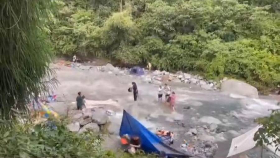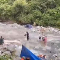 据网传视频,山洪暴发时,许多游客在浅滩玩耍,其中还有孩童,有游客在向岸边撤离过程中被困在水中。岸边布置有不少帐篷、露营桌椅等设备,没几秒就被冲走。另有视频显示,山洪暴发后,不少游客攀附在沟边的岩石上,湍急的山洪从中间流下。一名男子抱着幼儿被困在水流中央的一块石头上,但最终还是被快速涨起的洪水冲走。