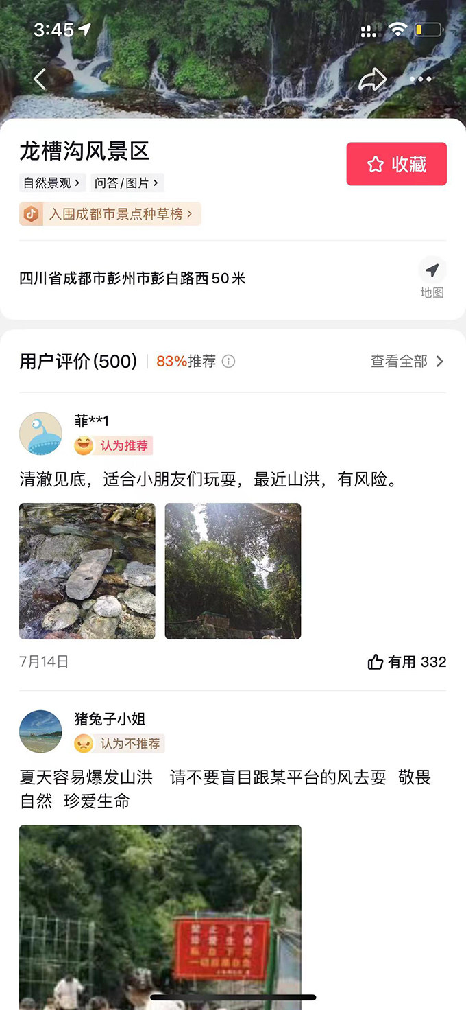 14日15时许,在抖音搜索栏中输入“龙漕沟”关键词,仍然能搜索到“龙漕沟风景区”的地点信息,并且标明该景点入围了“成都市景点种草榜”。点进地点后,可以看到具体位置标识,及用户留下的500条评价,其中83%均为好评。