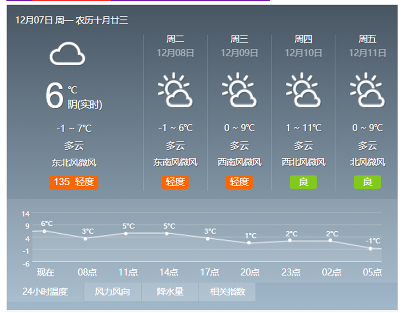 今天是12月7日,阴天转多云 0-7℃ 偏北风转东北风3级左右,空气质量指数:170,中度污染。