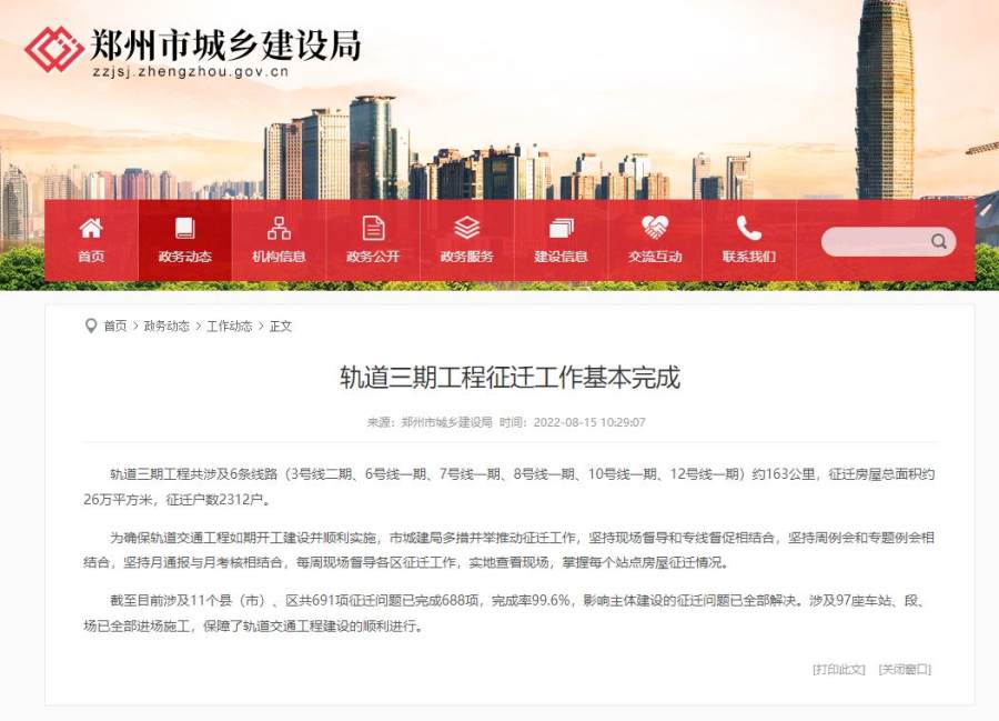 8月17日,正观新闻记者从郑州市城乡建设局获悉轨道三期工程征迁工作基本完成,轨道三期工程共涉及6条线路(3号线二期、6号线一期、7号线一期、8号线一期、10号线一期、12号线一期)约163公里,征迁房屋总面积约26万平方米,征迁户数2312户。