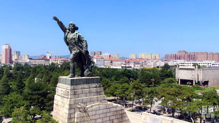 △辽沈战役革命烈士纪念塔,塔身高8米,塔顶是一座持枪振臂呐喊的解放军战士全身塑像。(总台央视记者范凯拍摄)
