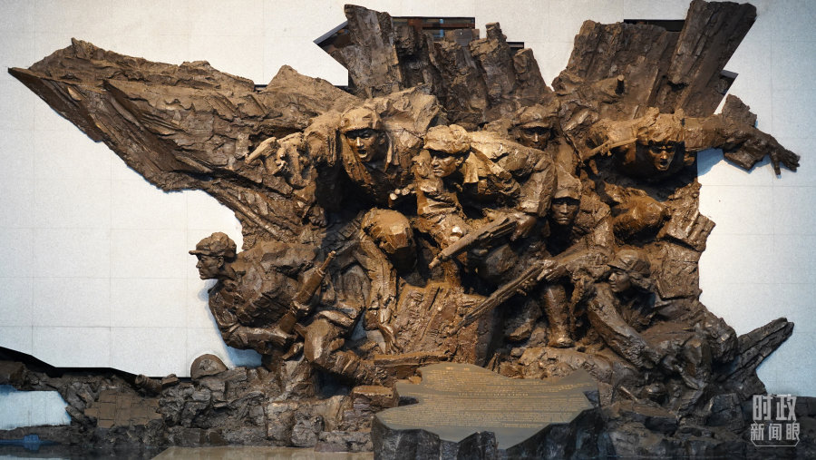 步入序厅,迎面是名为“决战决胜”的大型浮雕,展现的是冲锋战士冒着炮火奋勇向前。