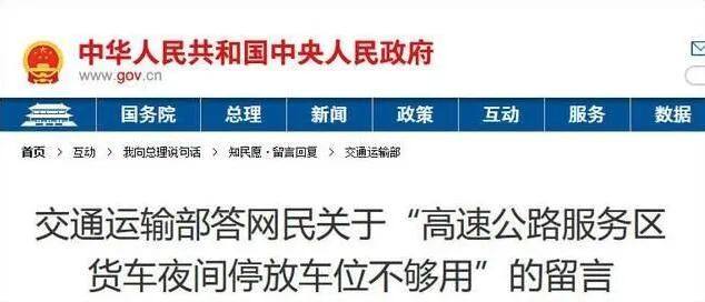 中国政府网“互动”栏目8月18日刊发了交通运输部答复网民关于“高速公路服务区货车夜间停放车位不够用”留言的相关内容。