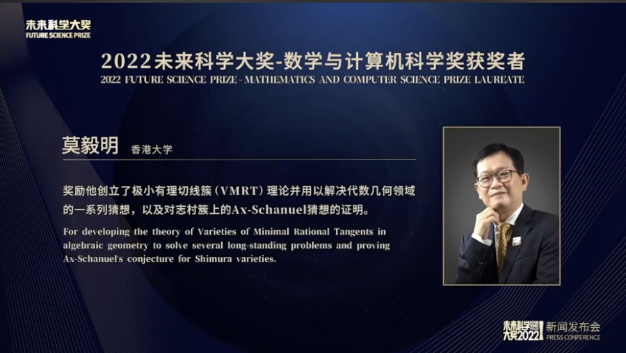 “数学与计算机科学奖”获奖者莫毅明,奖励他创立了极小有理切线簇(VMRT)理论并用以解决代数几何领域的一系列猜想,以及对志村簇上的 Ax-Schanuel 猜想的证明。