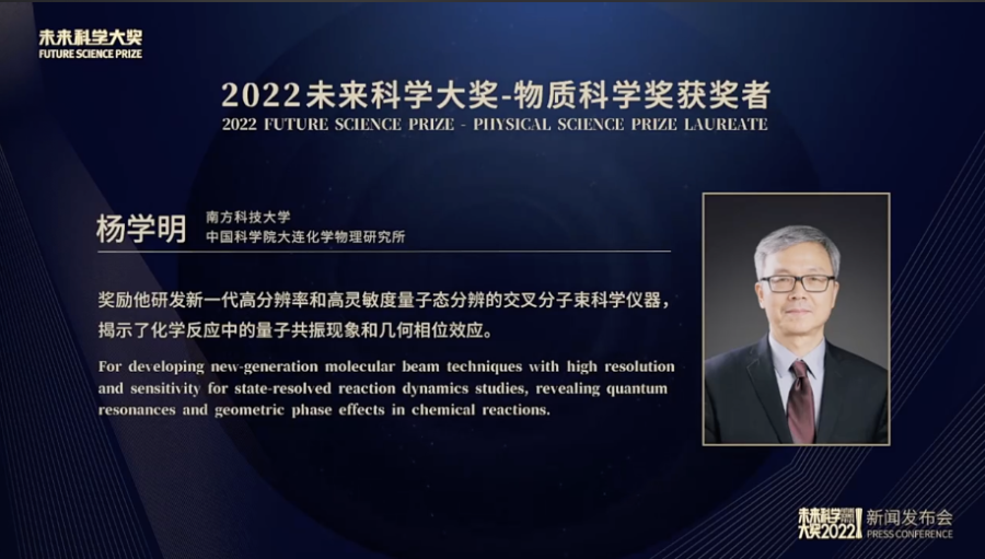 “物质科学奖”获奖者杨学明,奖励他研发新一代高分辨率和高灵敏度量子态分辨的交叉分子束科学仪器,揭示了化学反应中的量子共振现象和几何相位效应。