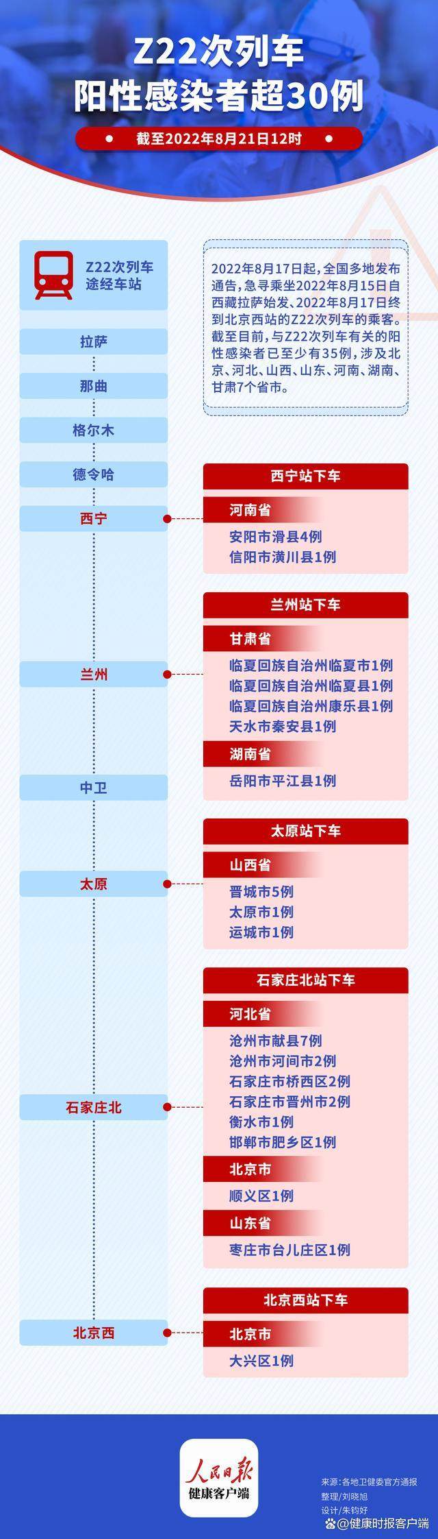 8月17日起,全国多地陆续发布通告,急寻乘坐8月15日自西藏拉萨始发、8月17日终到北京西站的Z22次列车的乘客。据健康时报不完全统计,截至8月21日12时,与Z22次列车有关的阳性人员已至少有35例,涉及北京、河北、山西、山东、河南、湖南、甘肃等7个省市。