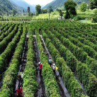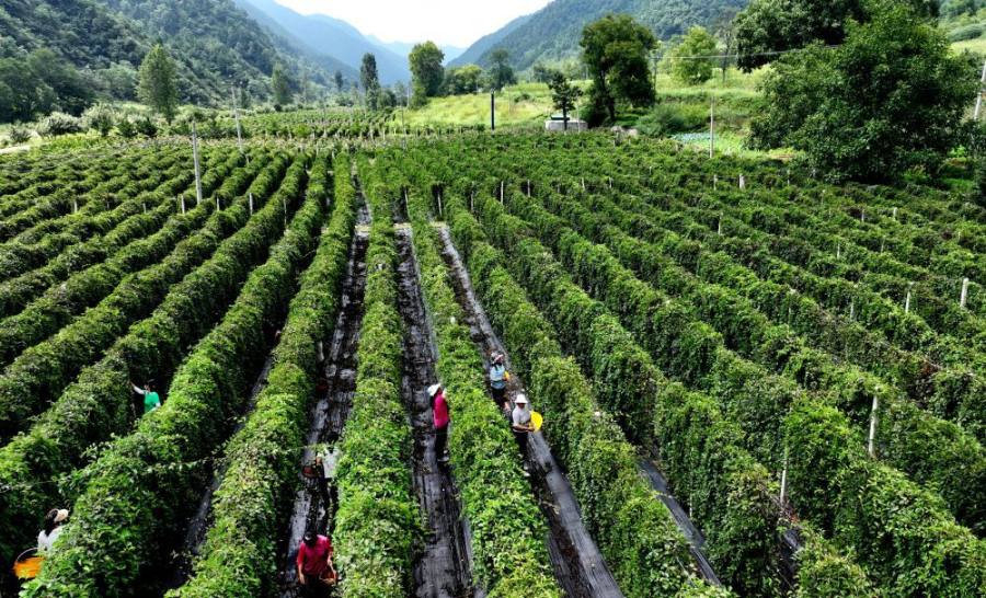 2022年8月21日,陕西省洛南县煜正中药材专业合作社的员工在田间采摘五味子(无人机照片)。新华社记者陶明摄