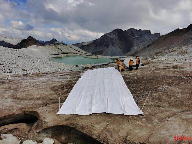 据了解,达古冰川是我国罕见的山地冰川,位于青藏高原向四川盆地过渡地带,是我国纬度最北的海洋性现代山地冰川,是冰川遗迹百花园,离大都市最近、最容易到达和接近的冰川之一。近年来,全球变暖对冰川的消融影响非常大,达古冰川的面积,从中科院西北研究院对达古冰川的监测,从1966年到1975年新中国第一次科考数据,一直到2017年监测的数据,达古冰川的面积在过去半个世纪内消融了75%左右。所以两年前,一项科学实验在四川阿坝州黑水县达古冰川上进行,就是给冰川盖上500平方米的巨型隔热毯,以人工干预手段,对冰川的消融减缓进行实验。今年8月,达古冰川盖上了2.0版“凉被”。