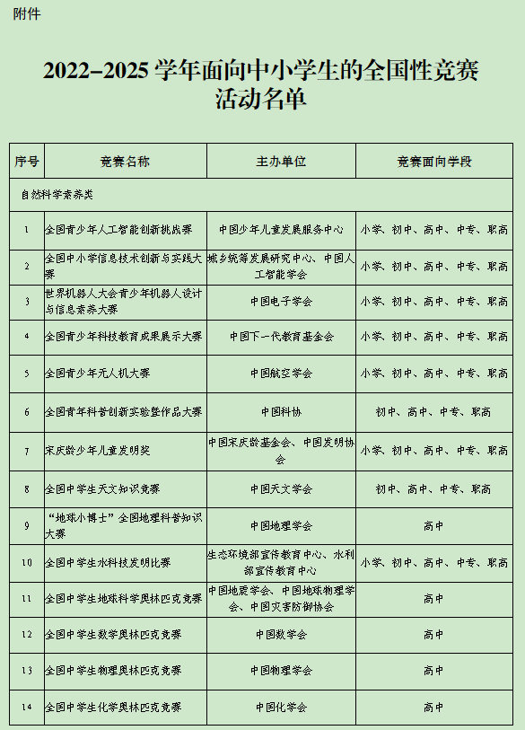 教育部办公厅今天发布通知,公示2022-2025学年面向中小学生的全国性竞赛活动名单。