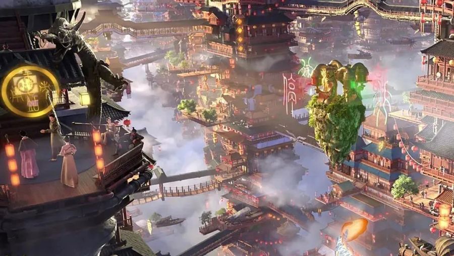 在蓬莱岛,遍布着形态各异的建筑,主人公杨戬驾驶着飞船快速穿梭,驾轻就熟;在方壶仙岛,仙人们的琼楼玉宇始终是一副灯火通明的景象,不尽繁华;瀛洲仙岛则是以敦煌的月牙泉为灵感,在一片沙漠绿洲之中屹立着高耸入云的楼阁。宏大的场景与细节的刻画,带来的是更上一层楼的视觉享受。导演赵霁曾透露:“我们想到瀛洲应该是这样,在一个沙漠当中有一个绿洲,绿洲里面有一座塔,周围全是黄沙,只有这座塔是红色的,非常有意思。”