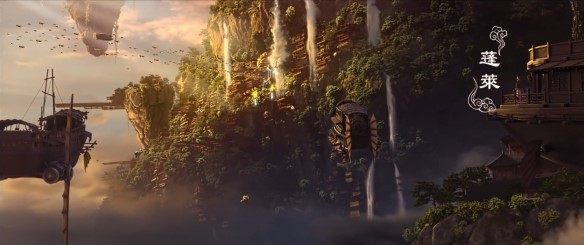 在影片中,借助强大的动画特效,塑造了蓬莱、方壶、瀛洲三大仙岛。云气渺渺,神仙们乘坐飞船穿行其间,可以像凡人一样开展各种活动:喝酒、吃饭、休息、坐船、赌博、抓罪犯……不同场面的转换让神界也显得不那么高高在上,十分“接地气”。