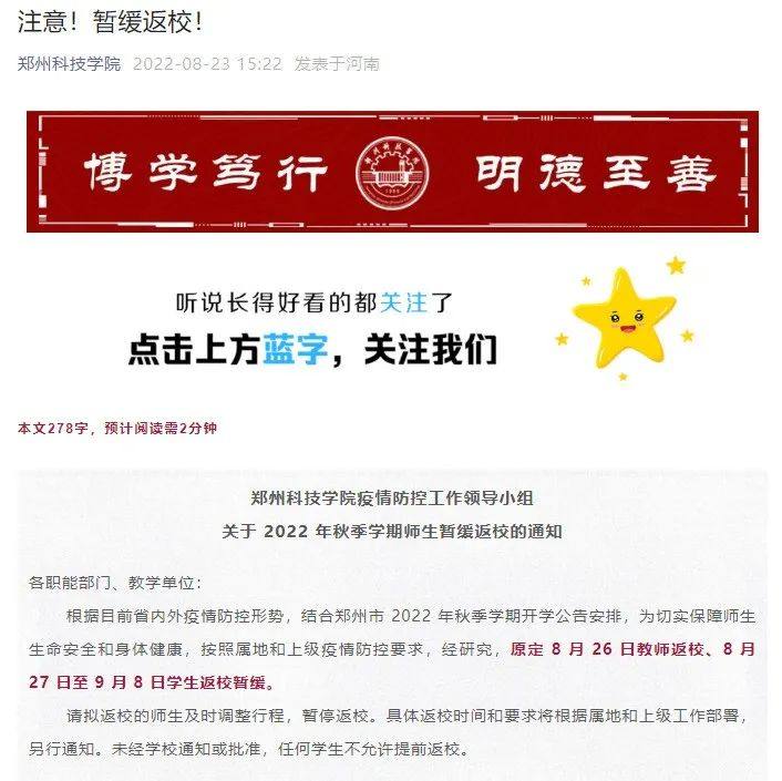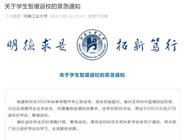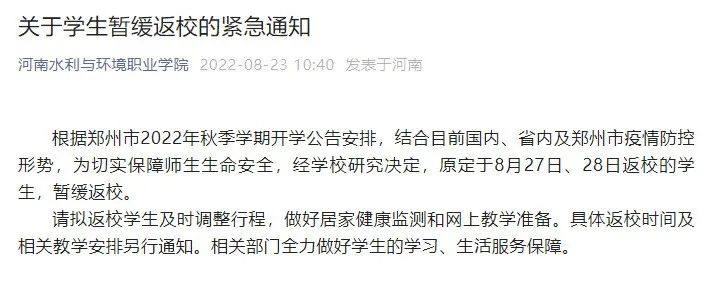 原定于8月22日至24日、26日至27日返校的学生,暂缓返校。请尚未返校的学生,及时调整行程暂停返校;已返校的学生按相关要求入校。具体返校时间及考试教学安排另行通知。