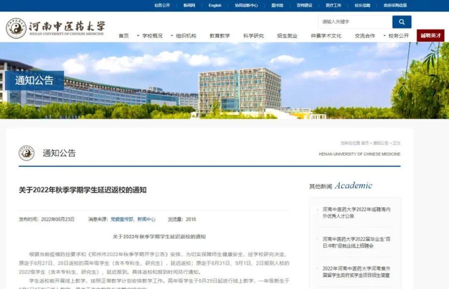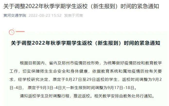 原定于8月27日至28日返校的高年级学生(含本专科生、研究生),延迟返校;原定于8月31日、9月1日、2日报到入校的2022级学生(含本专科生、研究生),延迟报到。具体返校和报到时间另行通知。