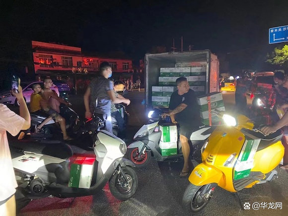 21日晚上,许多摩托车友自发来到现场,帮助运送物资。受访者供图