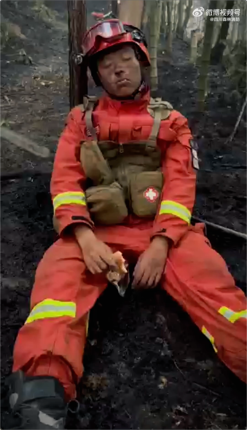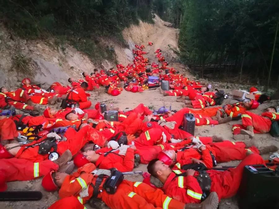 休息期间,与山火搏斗了十几个小时的他们和衣而卧,倒头就睡,有人睡在滚烫的地面上,有人睡在山林中。